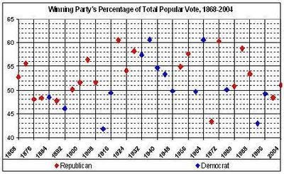 But there is no doubt that we are still in a Republican era. Republican control of Congress is as secure as it has been since the 1920s, as is Republican control of State governments. The current Republican era will end -- if and when it does -- in the aftermath of an economic, social, or military trauma whose nature and timing are unpredictable. [It turned out to be economic trauma, which began near the end of Bush’s second term with a stock-market crash and continued on into the Great Recession.]
