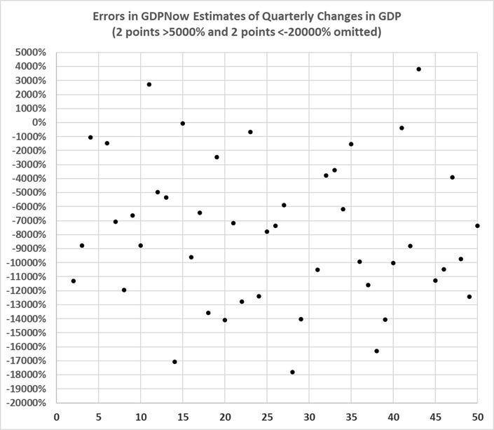 If the Fair model seems bad, consider the forecasts of changes in GDP that are published by the Federal Reserve Bank of Atlanta at GDPNow. The forecasts are expressed as changes in the annual rate of real (inflation-adjusted) growth in GDP. The website includes a misleading graph of the increasing accuracy of the forecasts. It is misleading because the forecasts are compared to the initial estimates of quarterly GDP changes issued by the Bureau of Economic Analysis (BEA). When the estimates are compared with BEA’s final estimates of quarterly GDP, this is the result: