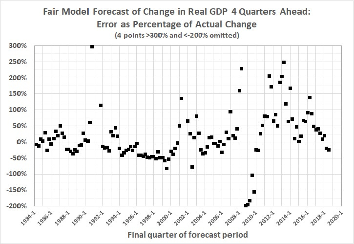 “Fair” refers to Professor Ray C. Fair of Princeton University, the creator of the model in question. The model isn’t fair (as in fair to middling), it’s a dismal failure. Most of the errors are huge.